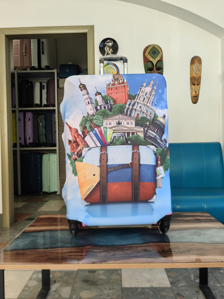 Наши разноцветные чехлы для чемоданов не только избавят от необходимости в упаковке пленкой в аэропорту (экономия в среднем 500 рублей за полет), но и легким движением руки преобразят чемодан и придадут ощущение, что у вас появился еще один красивый чемодан. Сам чехол на 98 % состоит из эластичных полиэстера и спандекса, которые превосходно тянуться, не искажая рисунок и цвета. Чехлы для чемоданов защитят от пыли и грязи, легко стираются и очень просты в «надевании» :)